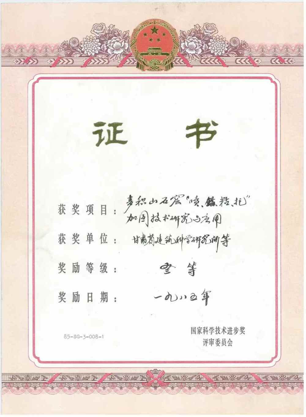 鑒定認(rèn)為,麥積山石窟維修加固工程在總結(jié)了國(guó)內(nèi)巖體加固經(jīng)驗(yàn)的基礎(chǔ)上,結(jié)合麥積山石窟巖體的特點(diǎn)和不改變?cè)瓲畹脑瓌t,成功地采用了“噴、錨、粘、托”綜合加固技術(shù),為保護(hù)石窟文物開創(chuàng)了一條新的途徑。1985年,甘肅建科院榮獲國(guó)家科技進(jìn)步獎(jiǎng)三等獎(jiǎng)、甘肅科技成果獎(jiǎng)二等獎(jiǎng)。