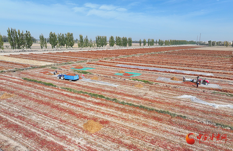 “我們種植的辣椒品種主要是朝天椒,成熟后需要先割倒擺放在壟溝上晾曬,一方面是辣椒干透后機(jī)械脫粒,另一方面也是為了防霜凍。這些朝天椒都是訂單辣椒,等過幾天曬好后由企業(yè)統(tǒng)一收購,直接運(yùn)走,每畝產(chǎn)量500公斤左右,每畝收益能達(dá)到5000元以上。”種植大戶韓克紅說。