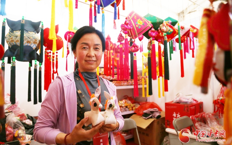 在展館的一角,來自慶城的一位香包繡制商戶喬志梅正在現(xiàn)場推銷著自己帶來的產(chǎn)品。其中驢形香包最為顯眼,據(jù)她介紹,驢形香包多數(shù)呈現(xiàn)黑色,有忠厚、老實(shí)之寓意,在當(dāng)?shù)貥O受喜愛。但她制作的驢形香包,通體為白色,鬃毛為粉色,驢耳一上一下較為可愛俏皮。