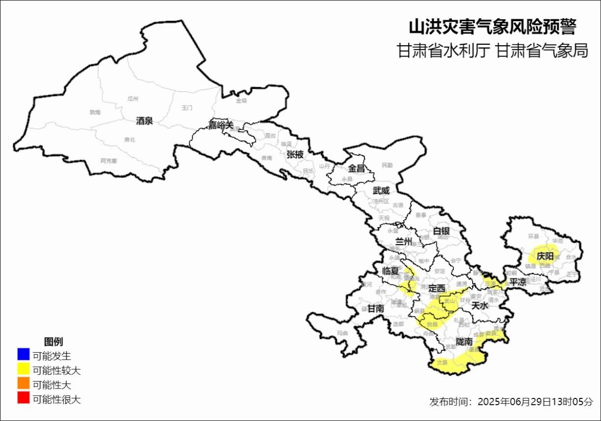 根據(jù)省氣象局《重大氣象信息專報(bào)》(2025年甘氣第10期),未來十天甘肅省多降水天氣,具有對流性強(qiáng)、小時(shí)雨強(qiáng)大、累積雨量大等特點(diǎn),洪水災(zāi)害風(fēng)險(xiǎn)高。6月29日13時(shí),省水利廳、省氣象局聯(lián)合發(fā)布山洪災(zāi)害氣象風(fēng)險(xiǎn)預(yù)警:預(yù)計(jì),6月29日14時(shí)至30日14時(shí),白銀市(景泰縣),武威市(古浪縣),定西市(臨洮縣、渭源縣、通渭縣、隴西縣、漳縣、岷縣),臨夏州(廣河縣、東鄉(xiāng)縣、康樂縣),甘南州(臨潭縣、卓尼縣、舟曲縣、迭部縣),天水市(秦安縣、甘谷縣、武山縣、張家川縣),隴南市(宕縣、禮縣、武都區(qū)、成縣、文縣、康縣、徽縣、兩當(dāng)縣),平?jīng)鍪校o寧縣、崆峒區(qū)、華亭市、莊浪縣),慶陽市(西峰區(qū)、慶城縣、環(huán)縣、華池縣、鎮(zhèn)原縣)等地區(qū)發(fā)生山洪災(zāi)害可能性較大(黃色預(yù)警)。
