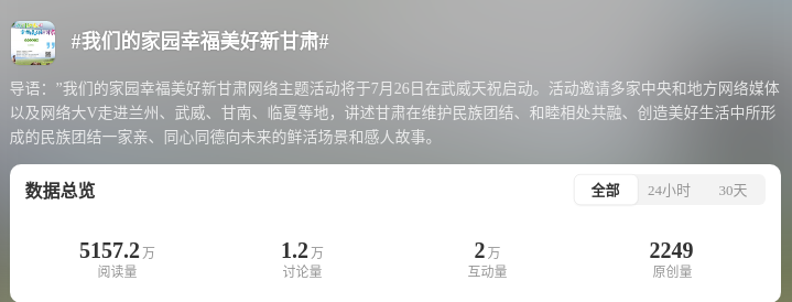 為深化互動引導,打造高流量IP,@甘肅網信、@快看甘肅等官方賬號發(fā)起社交平臺互動話題#我們的家園幸福美好新甘肅#。結合#厚道甘肅##萬千氣象看甘肅#等話題,@中新觀隴、@中國甘肅網、@甘肅好網民、@蘭州新區(qū)發(fā)布、@甘南融媒等賬號同步發(fā)力、同頻共振。目前,該話題總閱讀量超5530萬人次,討論互動量3.2萬人次。