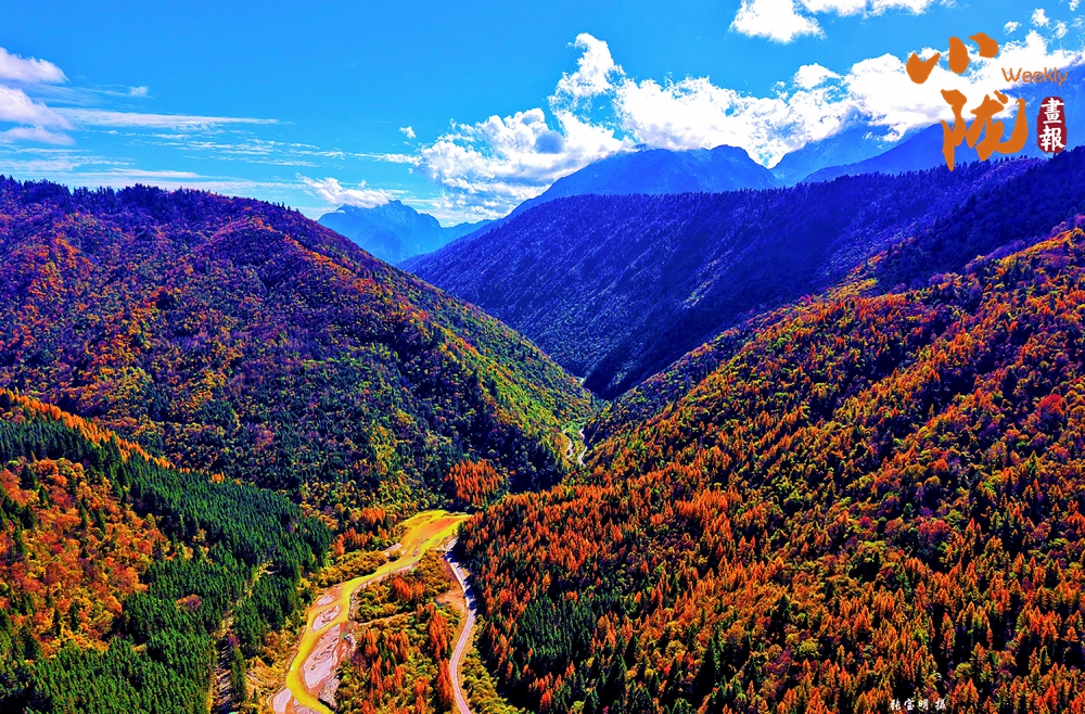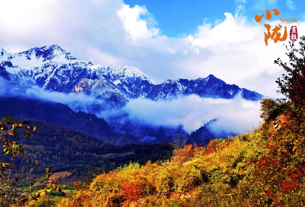 山巔的白雪與彩林形成鮮明對比,紅與黃,白與藍,在陽光的映照下,共同編織出一幅溫柔而夢幻的畫卷。