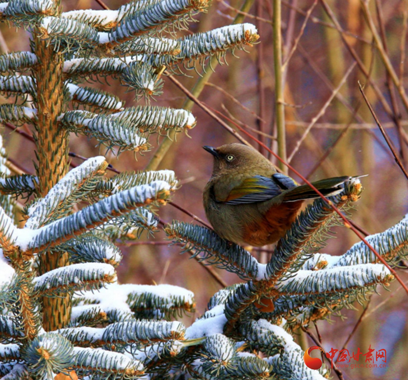 鏡頭之中,一只橙翅噪鹛靜棲于積雪覆蓋的松枝之上,宛如冰雪秘境中的靈動(dòng)精靈。它通體覆著柔和的灰褐色羽衣,橙黃色的初級(jí)飛羽在皚皚白雪的映襯下愈發(fā)鮮亮,臀部與下腹部的黃褐色絨羽則增添了幾分溫婉質(zhì)感。鳥(niǎo)兒側(cè)首凝望,眼眸澄澈靈動(dòng),將這一山地物種特有的警覺(jué)與優(yōu)雅姿態(tài)展現(xiàn)得淋漓盡致。