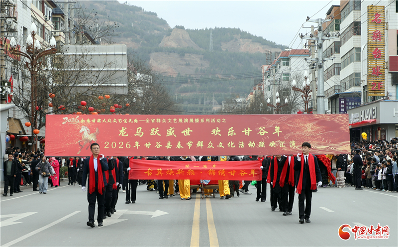 在新城路南關十字,這場以“龍馬躍盛世 歡樂甘谷年”為主題的聯(lián)歡匯演正式啟幕。作為“2026如意甘肅大眾文藝全民秀”的重要組成部分,匯演由56個方陣、34輛彩車、15個板塊構成,分別象征著56個民族同心、34個行政區(qū)域同行、15個鄉(xiāng)鎮(zhèn)同向,既彰顯著全縣上下紅心向黨的赤誠,也全面展現(xiàn)了古冀大地的非遺魅力與昂揚奮進的時代風貌,處處涌動著丙午馬年的磅礴春潮。