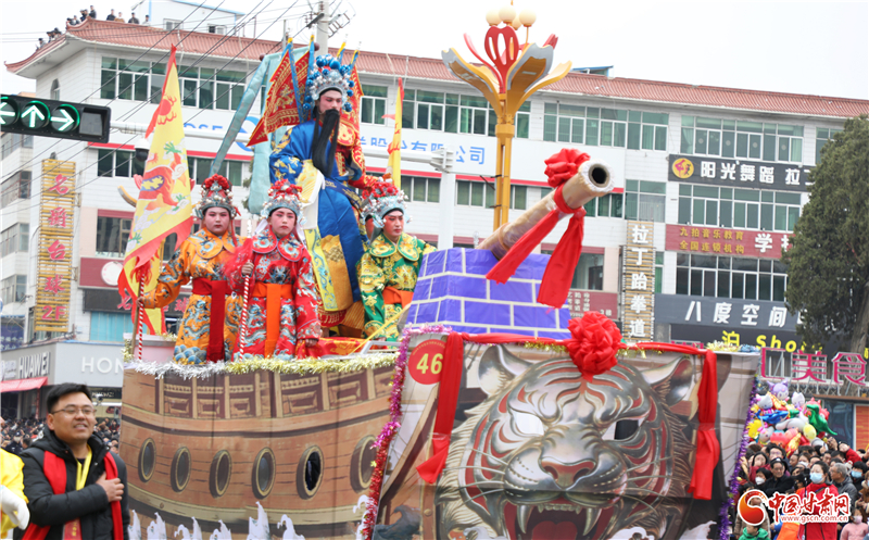 磐安、安遠、禮辛三鎮(zhèn)聯(lián)合打造的高臺方陣同樣吸睛奪目,藝人將戲劇人物、神話傳說以驚險奇巧的造型凌空呈現(xiàn),端坐高架的孩童揮手致意,成為街頭極具視覺沖擊力的流動風景,彰顯著民間藝人的非凡智慧與膽識。“高臺是咱們甘谷的絕活,精巧又驚險,老祖宗傳下來的好東西,代代都好看!”現(xiàn)場老人的稱贊道出了大家對本土非遺的喜愛。