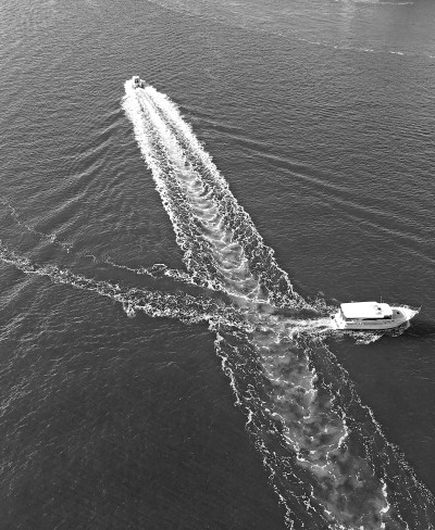 在這張照片里你看見了,天氣晴朗,海水蔚藍,兩船交叉駛過,畫出如此美麗的浪花。這兩艘游船并不是匆匆過客,而是相約作一次表演,海域內洋溢著歡樂的氣氛。