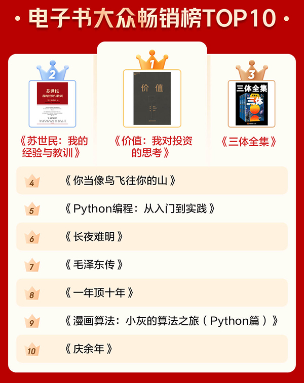 通過電子書暢銷榜TOP10和有聲暢銷榜TOP10可以看出,很多人愈發(fā)關注投資和管理等方面的內(nèi)容,也愈發(fā)注重個人學習。《價值:我對投資的思考》《蘇世民:我的經(jīng)驗與教訓》 分別位居電子書暢銷榜第一名和第二名?!吨袊?jīng)濟2020》《原則》進入有聲暢銷榜前十。此外,學習類圖書《Python編程:從入門到實踐》《漫畫算法:小灰的算法之旅(Python篇)》也上榜電子書暢銷榜前十。