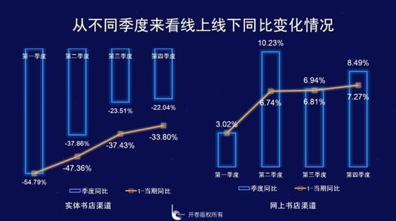 從不同類型書店來看,一二線城市以及超大書城類同比下滑嚴(yán)重,全年同比降幅均在35%以上,從不同季度來看,不同類型書城和整個(gè)實(shí)體店渠道趨勢變化類似。