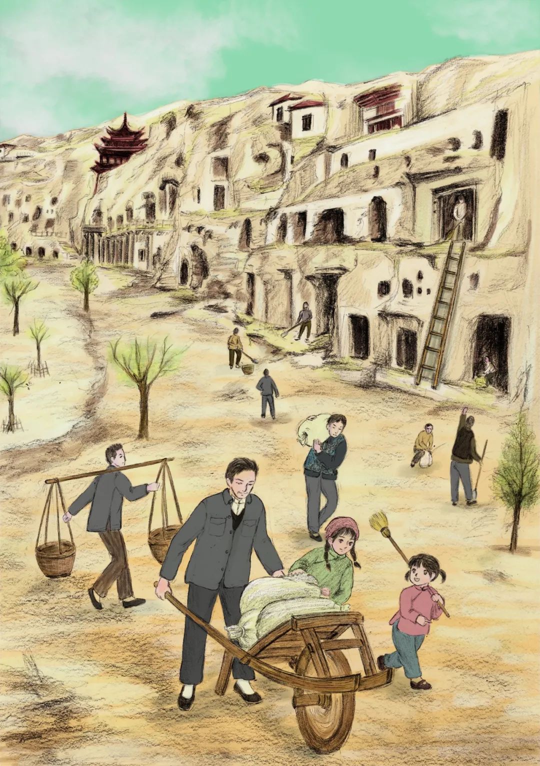 《敦煌小畫師》的故事,以民國時候國立敦煌研究所初創(chuàng)時期為背景,以一個小女孩欣潔的眼光,摹刻了一群以敦煌為文化藝術(shù)圣地而奮斗而獻身的藝術(shù)家和學(xué)者群體,這個群體以欣潔的父親為代表,他們舍棄溫暖濕潤的家鄉(xiāng),而遠(yuǎn)赴那個遙遠(yuǎn)荒涼的所在。因為那里有敦煌,因為那里保存著一千多年前的珍貴文物和彩塑壁畫,還因為那里急需有人來保護、修復(fù)和弘揚。他們來了,他們在這片戈壁之地安家扎根,在動蕩的社會時局下開始了為家為國的擔(dān)當(dāng),也開始了人生理想和價值的實現(xiàn)。這一切,以一個孩子的眼光來看,幾乎就是交織著欣喜和失望、歡喜與憂愁,從茫然無知到誠摯熱愛的一段生動故事。《敦煌小畫師》故事情節(jié)的設(shè)定,有起伏有高潮,有親情之愛,有田野之趣,更有人與人之間和諧相助的人性之美,讀起來有聽一首鄉(xiāng)村音樂的韻律感。我覺得,一部優(yōu)秀的兒童文學(xué)作品,應(yīng)該就是這個樣子。