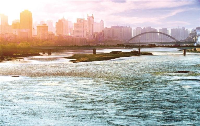 河分南北,勢(shì)接?xùn)|西。舒寧陜之博帶廣袖,帶青藏之峨冠雪衣。山逶迤而續(xù)祁連,水澎湃而瀉右?guī)住R洮湟之迤邐,有容乃大;與華夏之康莊,唇齒相依??睾游髯呃?,自古而始;俯渭涇秦川,由朝至夕。綴葫蘆狀岸渚坪灘,幾多古渡;依膏腴處坡谷盆地,即就蕃息。筑虹蜺經(jīng)百年,鐵橋第一;盤(pán)游龍於今朝,立交數(shù)十。去病鞭地,五泉山勝于秀逸;永誠(chéng)建院,白塔寺高于云齊。指點(diǎn)九州,大禹登九州之臺(tái);漂流黃河,洋人恐招手之磯。草覆馬銜而能牧,林茂興隆云可棲。繞營(yíng)盤(pán)高嶺排五,峙雄關(guān)沿河有七。留千古名,白馬浪細(xì)聽(tīng)湍流不息;鎖萬(wàn)代鑰,金城關(guān)只留站牌不奇。雷壇留碑,金天觀曾殿宇壯麗;華林無(wú)寺,節(jié)能燈照幽路石基。湍流黃河,九曲回腸依然東去;水轉(zhuǎn)輪盤(pán),十方高地亦滿(mǎn)紛披。