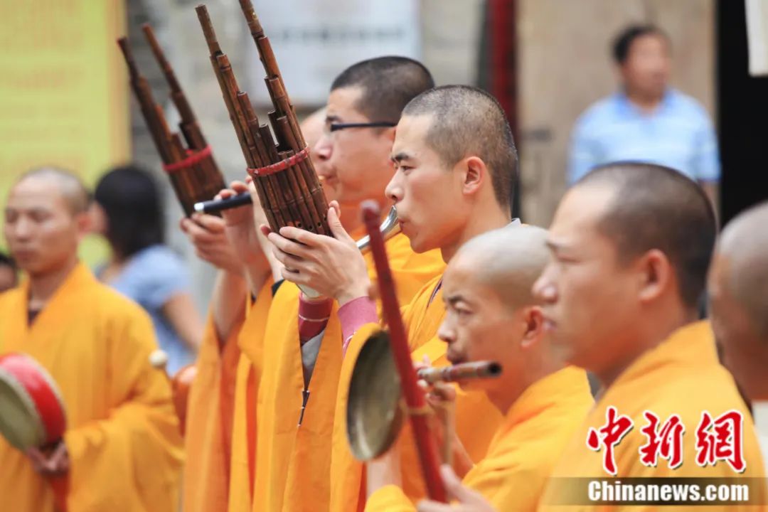 2011年7月,在山西五臺(tái)山南山禪寺,僧人演奏漢傳佛樂。中新社記者 韋亮 攝