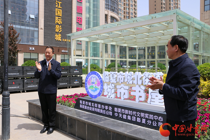 甘肅省委宣傳部副部長、省新聞出版局(版權局)局長王成勇(左)為臨夏市城北街道城市書屋揭牌
