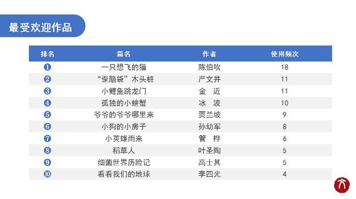 2021年度十大作品榜單為:《一只想飛的貓》(作者陳伯吹)、《“歪腦袋”木頭樁》(作者嚴文井)、《小鯉魚跳龍門》(作者金近)、《孤獨的小螃蟹》(作者冰波)、《爺爺的爺爺哪里來》(作者賈蘭坡)、《小狗的小房子》(作者孫幼軍)、《小英雄雨來》(作者管樺)、《稻草人》(作者葉圣陶)、《細菌世界歷險記》(作者高士其)、《看看我們的地球》(作者李四光)。