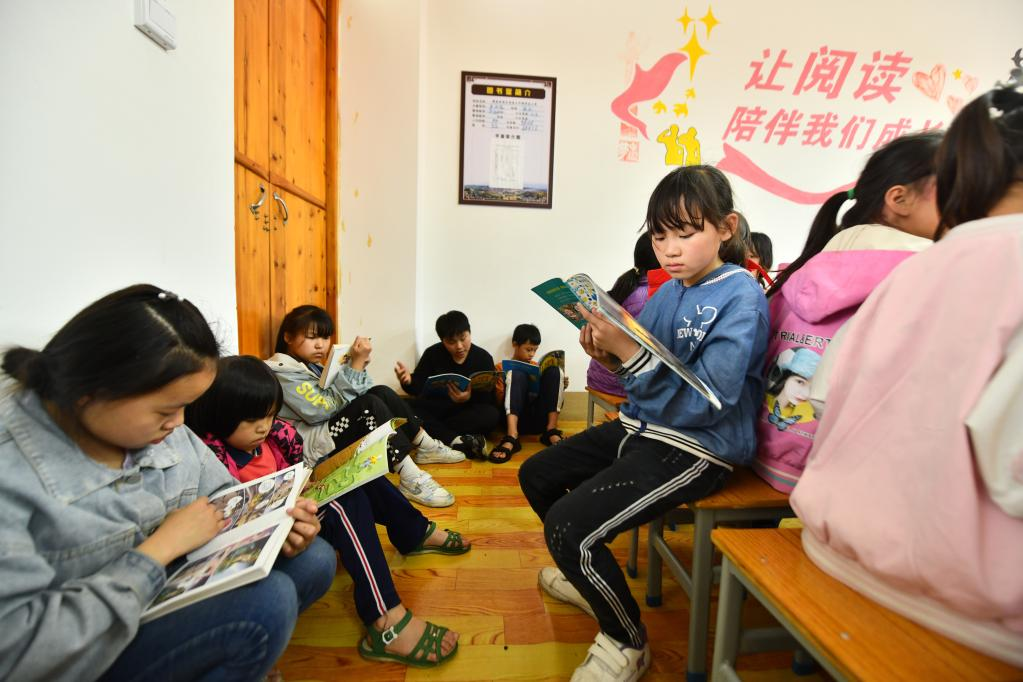 骨龍村小學(xué)學(xué)生在圖書室閱讀(5月25日攝)。
