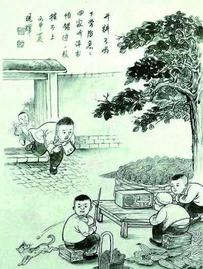劉現(xiàn)輝的一套四冊(cè)繪畫(huà)作品《童年那些事兒》(花山文藝出版社出版),就是一次目光穿越時(shí)光阻隔,對(duì)童年和故鄉(xiāng)的深情佇望。經(jīng)由長(zhǎng)久而專(zhuān)注的凝視,一縷縷游絲般輕淡的鄉(xiāng)思,逐漸擴(kuò)展匯聚成一種濃郁的故土深情,仿佛滿(mǎn)天云錦,在靈魂的天空閃現(xiàn)著動(dòng)人的光華。
