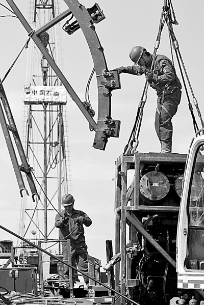 在位于克拉瑪依的新疆油田公司百口泉采油廠瑪湖第一采油作業(yè)區(qū),石油工人正在進行測試作業(yè)。閔勇攝/光明圖片