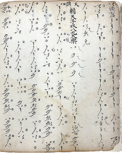 二是音位型曲譜,以各類符號(hào)指代樂器上的音位。使用這類曲譜,必須首先明確弦樂器的定弦、定品方式,管樂器的開孔標(biāo)準(zhǔn)和按孔、吹奏方法,才能確定每個(gè)音位的實(shí)際音高。正因如此,音位譜往往與樂曲宮調(diào)密切相關(guān)。同一份譜子,換用不同宮調(diào)演奏,音響大不相同。20世紀(jì)初,敦煌藏經(jīng)洞曾發(fā)現(xiàn)一份五代時(shí)期的曲譜,采用20個(gè)琵琶音位符號(hào)記錄,是目前已知這類曲譜的早期代表。