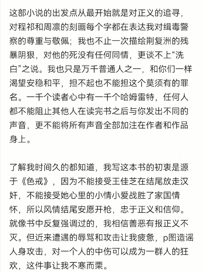 在去年10月14日,疑似《風情不搖晃》的作者在其未經(jīng)認證的社交媒體賬號上表示,“小說的出發(fā)點是對正義的追尋”。在發(fā)布這條內容后,其賬號再未更新,該條微博也關閉了評論。