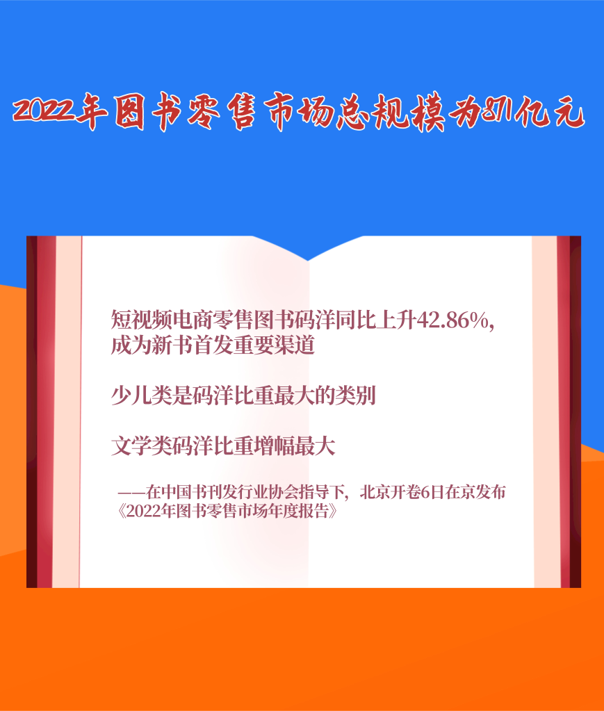 1月6日,在中國書刊發(fā)行業(yè)協(xié)會指導(dǎo)下,北京開卷信息技術(shù)有限公司在京發(fā)布《2022年圖書零售市場年度報告》。報告顯示,2022年我國圖書零售市場碼洋規(guī)模為871億元。短視頻電商零售圖書碼洋同比上升42.86%,碼洋占比趕超實(shí)體書店,成為新書首發(fā)重要渠道。