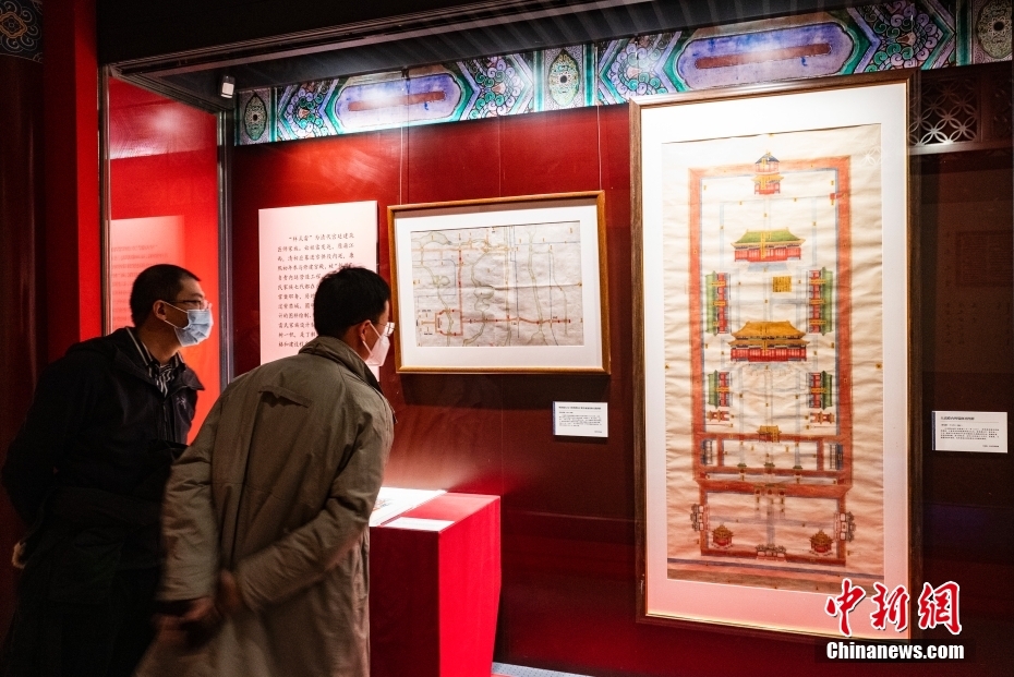 圖為“明清檔案”展區(qū)內(nèi)展示的“樣式雷”《大高殿內(nèi)坍塌修補(bǔ)圖樣》(右)等展品吸引觀眾查看。 中新社記者 侯宇 攝