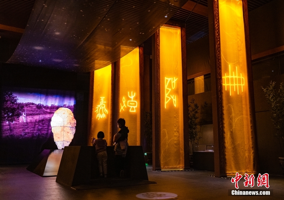 圖為“殷墟甲骨”展區(qū)內(nèi)的聲光互動(dòng)區(qū)吸引觀眾體驗(yàn)。 中新社記者 侯宇 攝