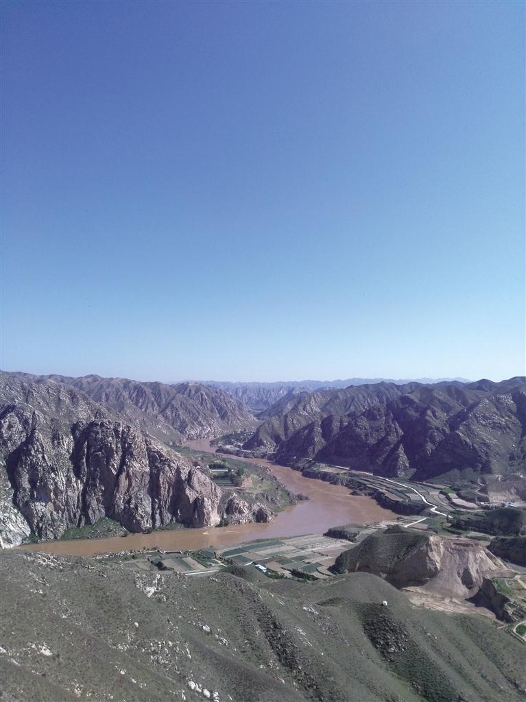 向西鳥瞰黃河,黃河幾乎直線撲面而來(lái),河水發(fā)黃,流淌緩慢。過(guò)去這里,河水湍急,老遠(yuǎn)就能聽到咆哮之聲。由于20世紀(jì)末,在下游20公里處建了小峽水庫(kù),河水被抬升,河水流緩。黃河北面,依然是光禿禿的山巒。低頭看腳下的黃河,南岸的漢長(zhǎng)城遺址清晰可見,旁邊有二三個(gè)人在農(nóng)田勞作。黃河流到此處,被腳下的九圪垯山迎面阻擋,折而向北,切開重重山巒,帶著野性,蜿蜒而去,一點(diǎn)兒也不留戀桑園子峽,不留戀九圪垯山,不留戀滄桑的大地和歲月。