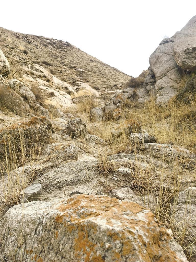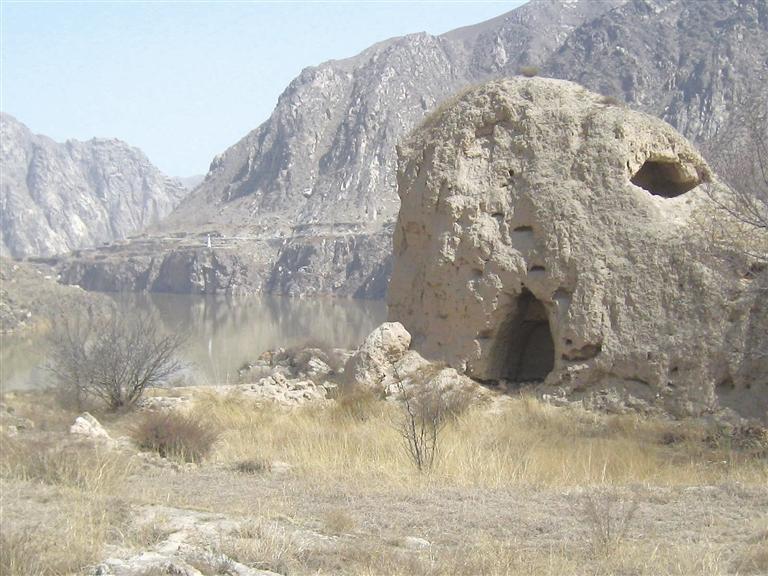 東坪向東300米,就是榆中境內(nèi)唯一遺留的一處漢長(zhǎng)城遺址,該遺址現(xiàn)只有一處墻墩,緊鄰黃河,圍長(zhǎng)40 余米,高約5米,無(wú)任何防護(hù)措施,墻壁上,有磚、石混雜其中,人工夯筑之痕清晰可辨。西側(cè)墻面上,還有人掏挖的小窯洞。高1.3米,深達(dá)50厘米。破壞嚴(yán)重。漢長(zhǎng)城遺址再向東200米,東金公路向右拐入七峴溝,向來(lái)紫堡川而去,而黃河則被東面的大山阻擋,無(wú)路可去,左拐北折而流向什川。此處就是著名的黃河大“幾”字灣的第一灣。第一灣的南岸,有十來(lái)戶人家,地名叫駱圈灣。由于地處古絲綢之路,曾建有駱駝圈和小型客棧供駱駝客隊(duì)歇腳而又在黃河拐彎處而得名,后來(lái),因諧音,叫羅泉灣。山腳下,有七八棵楊柳已吐綠。沿黃河,已無(wú)路可尋,就沿洪水沖的山溝上東山,還是無(wú)路,甚至沒(méi)有羊腸小道,巖石裸露,怪石嶙峋,坡陡難行。巖石層只有七八十米厚。此山的石頭,含有石英成分,石質(zhì)軟,無(wú)開采利用價(jià)值。再往上,就是黃土層,直到山頂。由于干旱,整個(gè)山上,無(wú)一棵樹木,甚至連灌木都沒(méi)有。耐堿耐旱的駱駝蓬只發(fā)出二厘米的枝蔓,一些蒿草和矮草,也剛發(fā)芽,還有一些匍匐在地面的無(wú)名小草,卻已開出了扁豆大小的艷麗的小花,有白色的和淡藍(lán)色的蝴蝶飛起飛落。爬到半山腰,太陽(yáng)已全面照曬,山坡雖陡峭,卻無(wú)陰涼可乘。渾身發(fā)熱,不得不解開衣扣,緩慢前行。