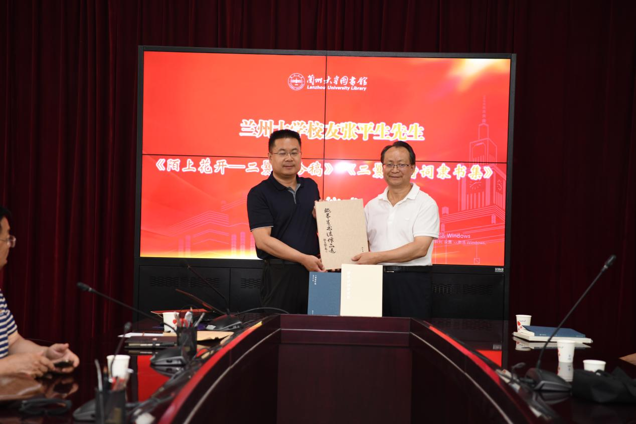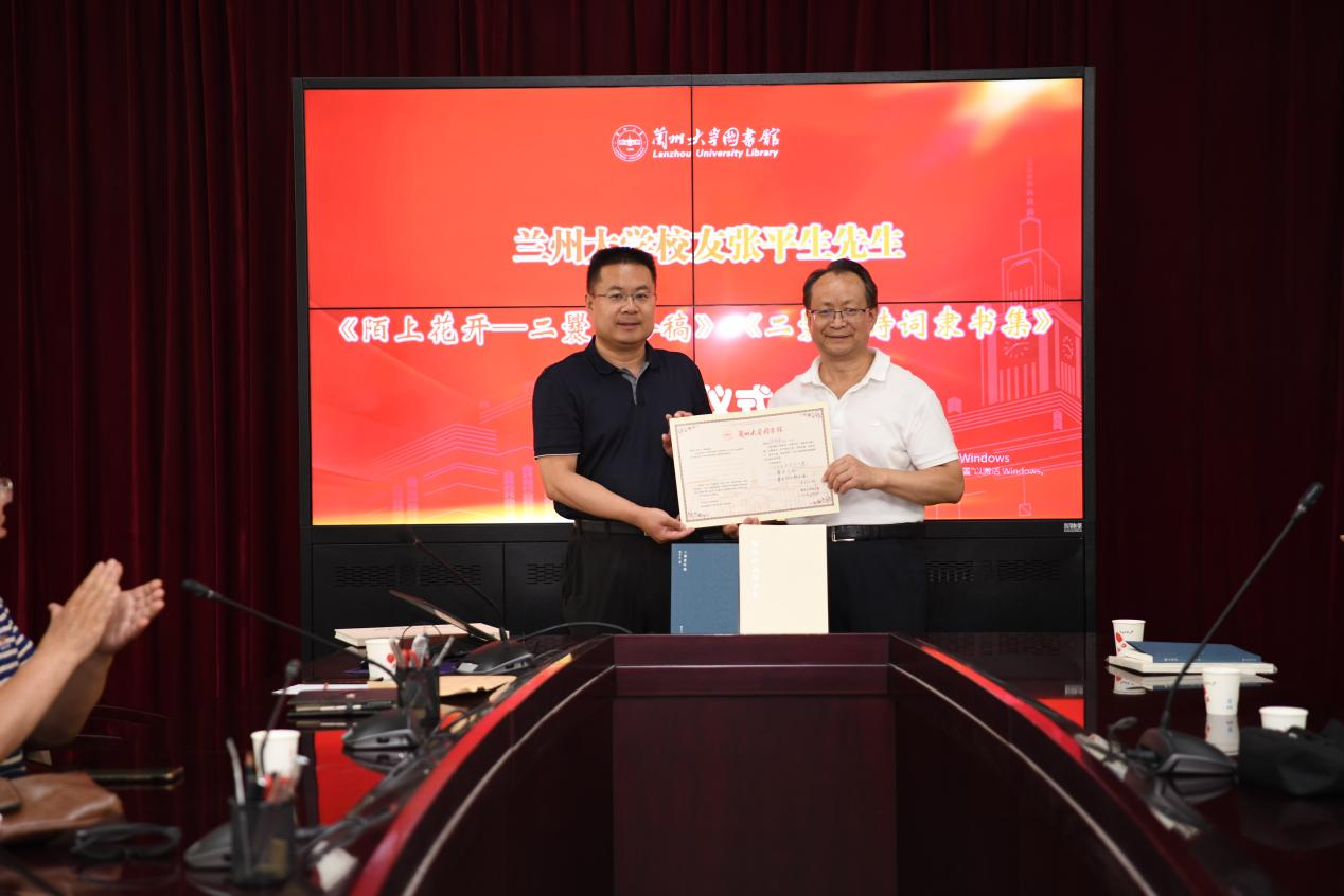 蘭州大學圖書館及直屬單位黨委書記王偉國向張平生頒發(fā)收藏證書