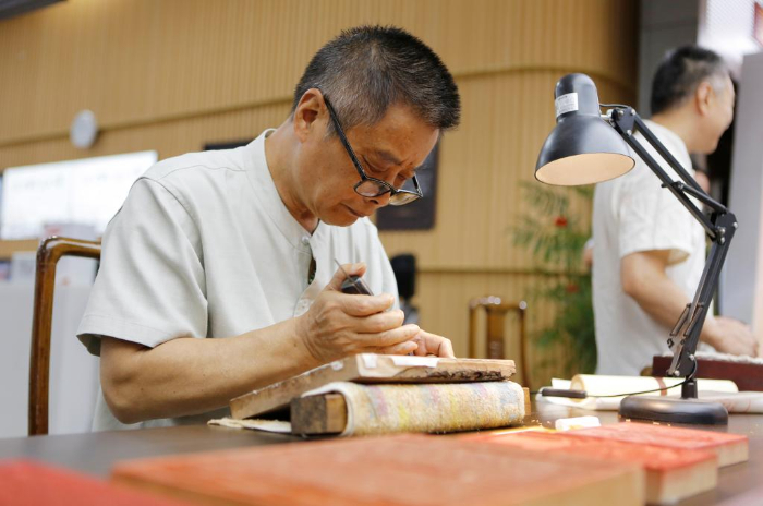8月22日,在揚(yáng)州市圖書館,江蘇省雕版工藝美術(shù)大師沈樹華在“古籍里的揚(yáng)州運(yùn)河文化”市集上為市民展示雕刻技藝。