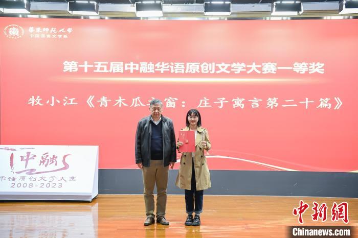 第十五屆中融華語原創(chuàng)文學(xué)大賽一等獎獲得者朱禹同(筆名牧小江)從孫甘露手中接過獎狀、獎杯。(華東師范大學(xué)供圖)