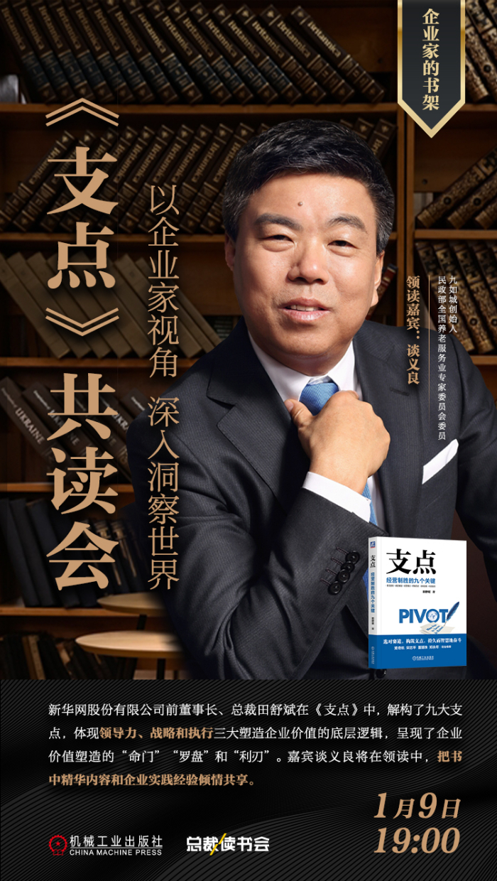 為了企業(yè)家更好地塑造企業(yè)價值,提升格局和眼界,1月9日19:00九如城創(chuàng)始人談義良將領(lǐng)讀《支點(diǎn)》一書,將在“認(rèn)識管理”視頻號上進(jìn)行直播。通過如何從多維度視角塑造企業(yè)價值、如何提升企業(yè)家的格局和眼界、如何做好團(tuán)隊塑造,構(gòu)筑人力資本基石三個方面,從企業(yè)家視角把書中精華內(nèi)容和企業(yè)實踐經(jīng)驗傾情共享,千萬別錯過。