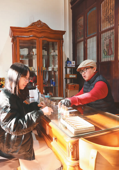 香水店主歐毓光在為游客試香。記者 康 樸攝