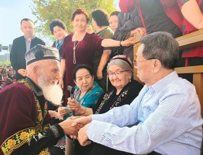 王蒙(右一)與新疆少數(shù)民族群眾一起跳舞。