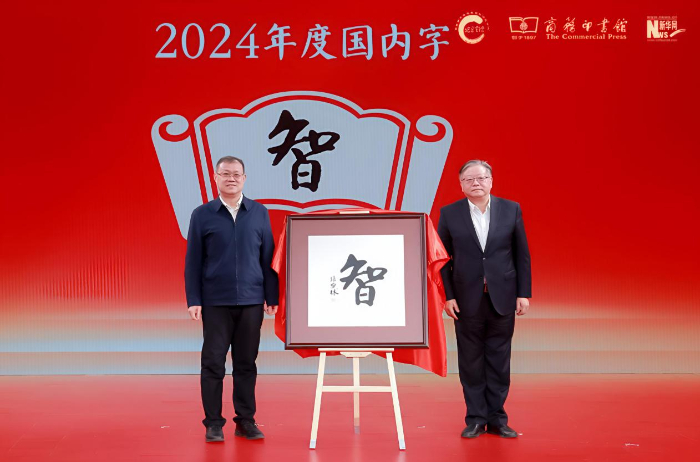 新華網(wǎng)黨委常委、總編輯車玉明(左),商務印書館黨委書記、執(zhí)行董事顧青(右)揭曉年度國內(nèi)字“智”。新華網(wǎng) 發(fā)