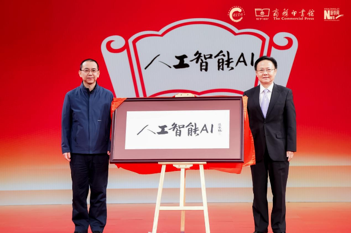 商務印書館副總經(jīng)理陳晗雨(左),中宣部“學習強國”學習平臺編委、副總經(jīng)理杜大力(右)揭曉年度國際詞“人工智能(AI)”。新華網(wǎng) 發(fā)