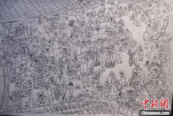 蘭州鋼筆畫(huà)愛(ài)好者周新平勾勒了數(shù)組關(guān)于鄉(xiāng)村記憶的鋼筆畫(huà),其中,《隴西臘月圖》是他歷時(shí)三個(gè)多月,手繪了200多村民,完成的一幅舊時(shí)農(nóng)民過(guò)年趕集的熱鬧圖景:賣糖葫蘆的小販、剪紙賀春的手藝人、趕車挑擔(dān)的趕集人……周新平說(shuō),他很怕“集市文化”將來(lái)被人們遺忘,用鋼筆記錄下來(lái),留住記憶里的“年味”以感悟鄉(xiāng)愁。