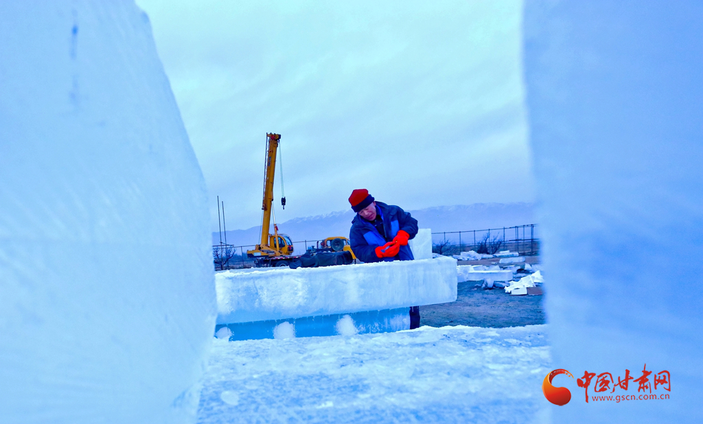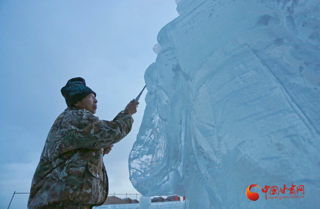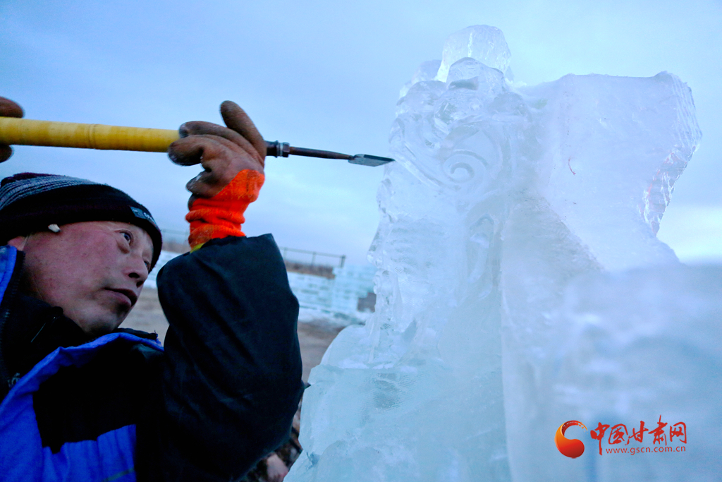 1月11日傍晚,張掖市甘州區(qū)屋蘭古鎮(zhèn)九曲黃河燈陣景區(qū)冰雕工藝師們正在加班加點(diǎn)趕制大型冰雕。