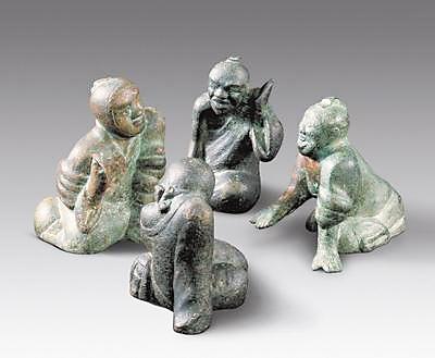 20世紀(jì)90年代甘肅靈臺縣出土了一組西漢銅質(zhì)博戲俑。俑最高9.2厘米,最寬9.7厘米。四俑相向跪坐,身著高領(lǐng)長服。其中二人頭挽發(fā)髻,二人以寬巾裹頭。坐姿不同,形態(tài)各異,有的前傾仰首,有的垂臂塌肩;有的袒胸露膊,似在伸手探??;有的屈腿斜身,默然扶膝靜坐。四俑的面部表情不同,刻畫細(xì)膩。他們或喜笑顏開,或嚴(yán)肅面對,或凝神沉思,或略顯悲愁,神態(tài)活現(xiàn),精彩逼真,具有高超的藝術(shù)性和研究價(jià)值。