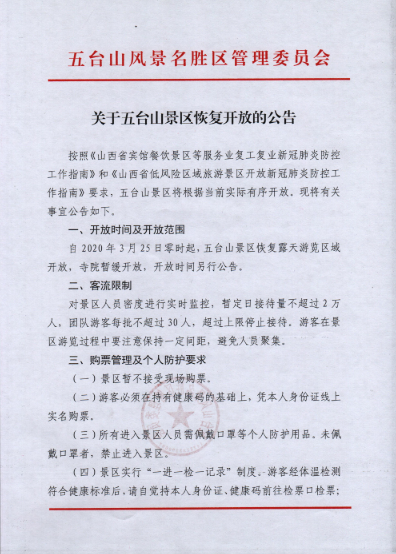 五臺山風(fēng)景名勝區(qū)管理委員會對外宣布,自2020年3月25日零時起,山西五臺山風(fēng)景名勝區(qū)恢復(fù)露天游覽區(qū)域開放,寺院暫緩開放,開放時間另行公告。