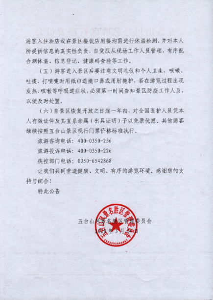 五臺山風(fēng)景名勝區(qū)強(qiáng)調(diào),恢復(fù)開放期間,五臺山將對景區(qū)人員密度進(jìn)行實(shí)時監(jiān)控。五臺山風(fēng)景名勝區(qū)管理委員會還宣布,自景區(qū)恢復(fù)開放之日起一年內(nèi),對全國醫(yī)護(hù)人員憑本人有效證件及其直系親屬(出具證明)予以免票優(yōu)惠。