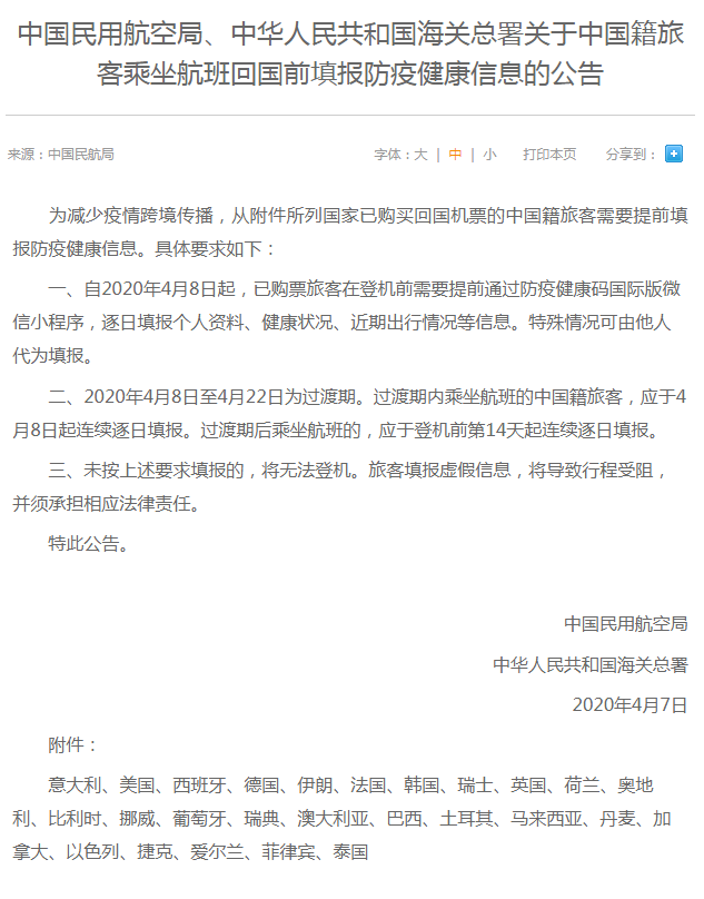 中國(guó)民用航空局、中華人民共和國(guó)海關(guān)總署4月7日聯(lián)合發(fā)布《關(guān)于中國(guó)籍旅客乘坐航班回國(guó)前填報(bào)防疫健康信息的公告》(以下簡(jiǎn)稱(chēng)《公告》)?!豆妗分赋觯?/span>自4月8日起,從意大利、美國(guó)、西班牙等26個(gè)國(guó)家已購(gòu)買(mǎi)回國(guó)機(jī)票的中國(guó)籍旅客需要在登機(jī)前提前填報(bào)防疫健康信息,包括逐日填報(bào)個(gè)人資料、健康狀況、近期出行情況等。旅客未按要求填報(bào)的,將無(wú)法登機(jī);填報(bào)虛假信息,將導(dǎo)致行程受阻,并須承擔(dān)相應(yīng)法律責(zé)任。