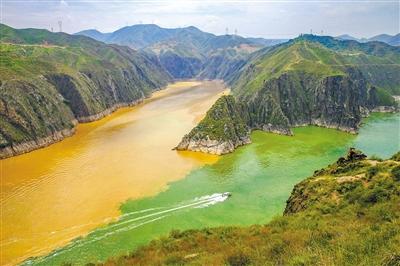 在永靖縣的劉家峽大壩前,綠色的黃河與黃色的洮河呈“Y”字形在龍匯山下交匯,在兩條河流的交匯處,也是一清一濁,互不交融,也形成了一條“涇渭分明”的水中分界線。一黃一綠兩條河流交匯以后河水也并沒有融合為一,而是繼續(xù)保持黃綠兩色前行,直到流入一公里多外的劉家峽大壩。