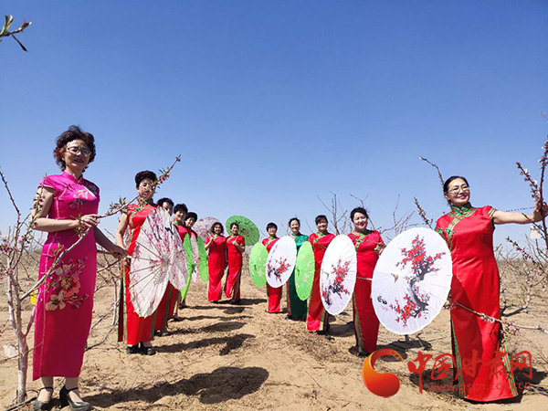 開幕式上,舉行了模特旗袍秀,賞花攝影等活動,參加活動的有關(guān)領(lǐng)導(dǎo)和志愿者徜徉桃林之間,藍天、大漠、桃花、春風(fēng),一張張美麗的笑臉在桃花叢中攝影留念,聆聽著大漠上桃樹成林的感人故事,一個人的桃花節(jié),也便成了千萬人的桃花匯!