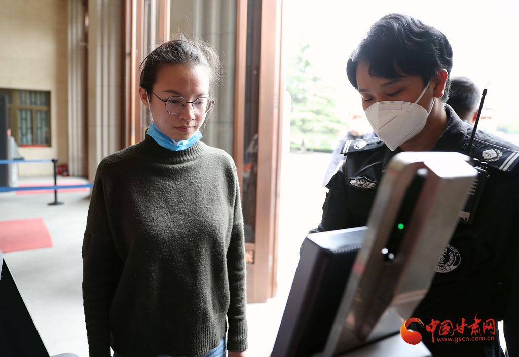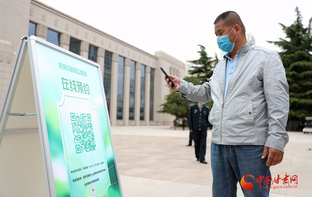 5月8日,在甘肅省博物館入口,一位市民正在通過在線預(yù)約的方式入館參觀。