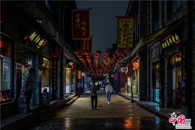 昨天(5月21日)下午三點(diǎn)半后,北京的天氣突然由白天變成了黑夜,當(dāng)時(shí)小編正在前門鮮魚口美食街拍攝,光線的明暗變化中,民國風(fēng)的灰墻青瓦的街道,忽然生出幾分魅惑而神秘的美感,紅燈籠在風(fēng)雨中搖曳、巨大的京劇招貼畫在墻上,胡同里人影憧憧……
