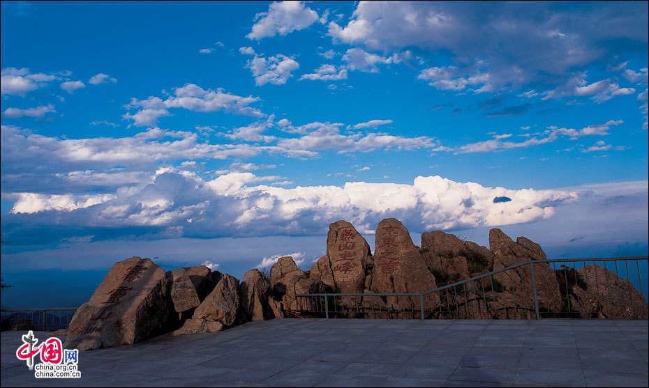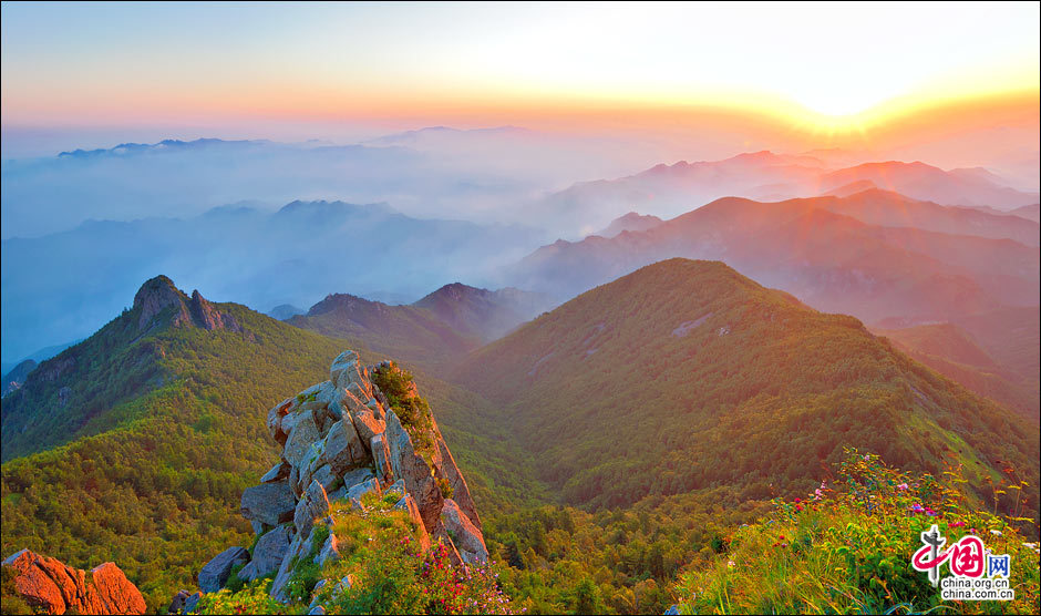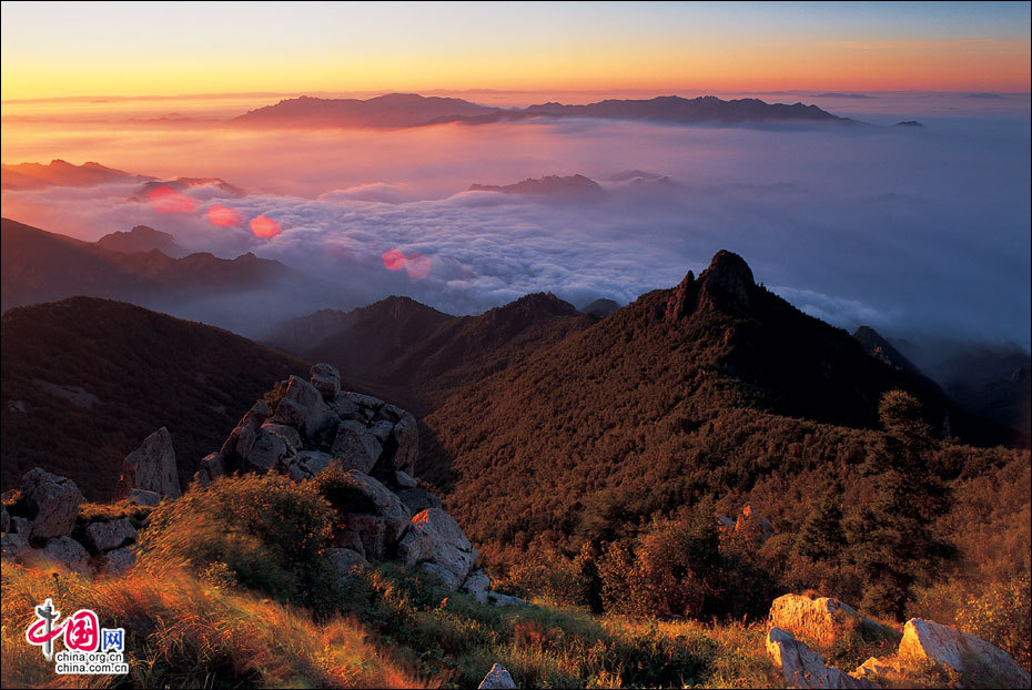 當(dāng)北京的第一縷陽光從這里升起。站在海拔2118米的頂峰平臺上,遙望東方,天際中開始露出幾抹灰色的浮云,隨后不斷地升騰、擴(kuò)大,繼而天邊漸紅,紅色越來越深,范圍越來越大,曙光漸露,丹霞輝映,把整個(gè)東方都變成濃濃的紅色。山峰在云霧中時(shí)隱時(shí)現(xiàn),彩云在天際間變幻,有時(shí)像奔馳的駿馬,有時(shí)像仙女飄逸,有時(shí)像玉樹瓊宮……千姿百態(tài),遐想無窮。猛然,比紅色的彩云更火紅、更光亮、更鮮艷的太陽露出了一條邊弧,緩緩上升。四周的云霧似乎忍受不了她那光茫的照射而淡化、隱退,太陽則很快掙脫了云霧與夜色的纏繞,迅速地上升,躍出天邊。霎時(shí),一輪紅日噴薄而出,金光四射,霞光瑞氣,照徹天宇,山巒、萬樹沐浴著朝陽的金輝,令人眼花繚亂。舉目四望,朝霞映照下的霧靈山,群峰起伏,云霧如海,波濤洶涌,九曲十八彎的旅游公路似戲水游龍,在峰巒間若隱若現(xiàn)。