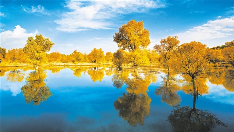 站在金波湖邊,滿目的赤橙黃綠與盈盈秋水互相映襯,胡楊金色的葉子倒映在潭水中,形成金色的水泊,微風掠過,層層漣漪漸漸擴大,最后消失在胡楊的倩影里,構成一幅幅精美的油畫。烘托出一幅“碧云天、黃葉地、秋色連波、波上寒煙翠”的絕美妙油畫卷。