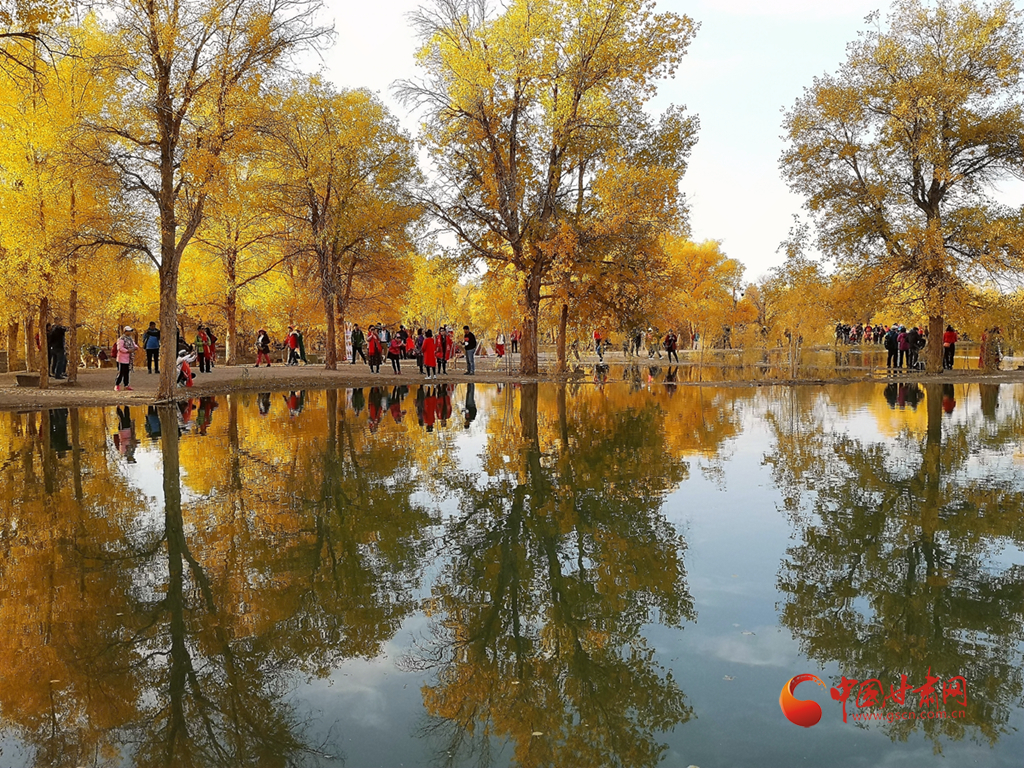 10月10日,在甘肅省酒泉市金塔沙漠胡楊林景區(qū),胡楊林在陽光的照耀下金黃燦爛,與湖水相映,令人流連忘返。(無人機照片)