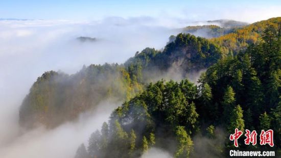 10月上旬,甘肅省定西市漳縣貴清山國(guó)家森林公園,朝陽(yáng)在云層中若隱若現(xiàn),云遮霧繞的景象讓層巒疊嶂的山峰成為“云端村落”,仿若仙境。漳縣貴清山國(guó)家森林公園境內(nèi)原始森林遍布,森林、動(dòng)植物資源十分豐富,貴清山被譽(yù)為隴中的“小華山”,是生態(tài)旅游勝地。