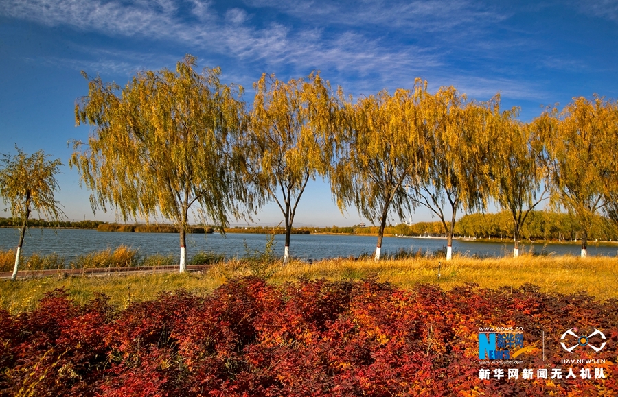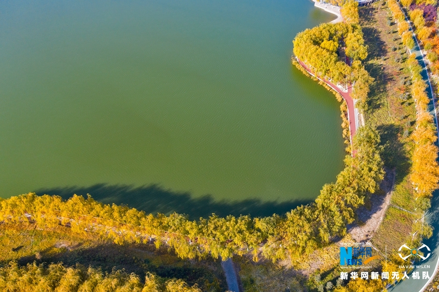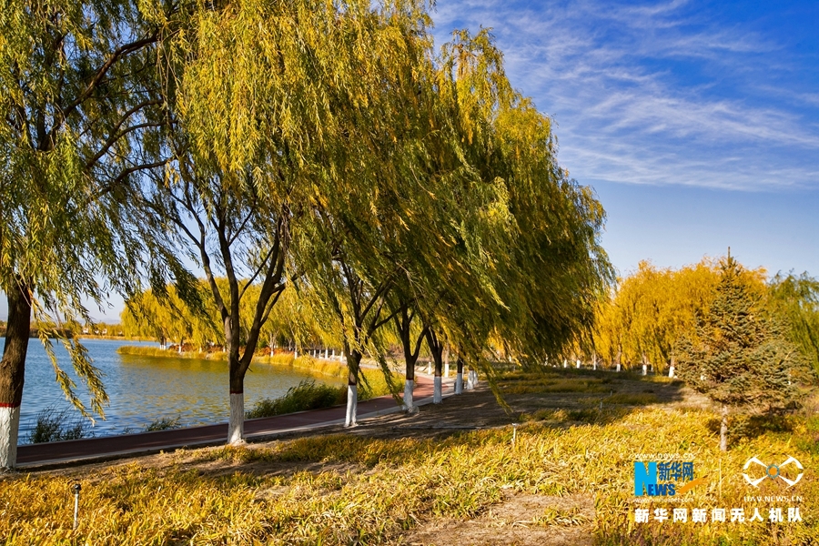 深秋時節(jié),國家4A級景區(qū)甘肅省張掖潤泉湖公園秋水依依,草木金黃,呈現(xiàn)出一幅斑斕畫卷。新華網(wǎng)發(fā)(成林 攝)